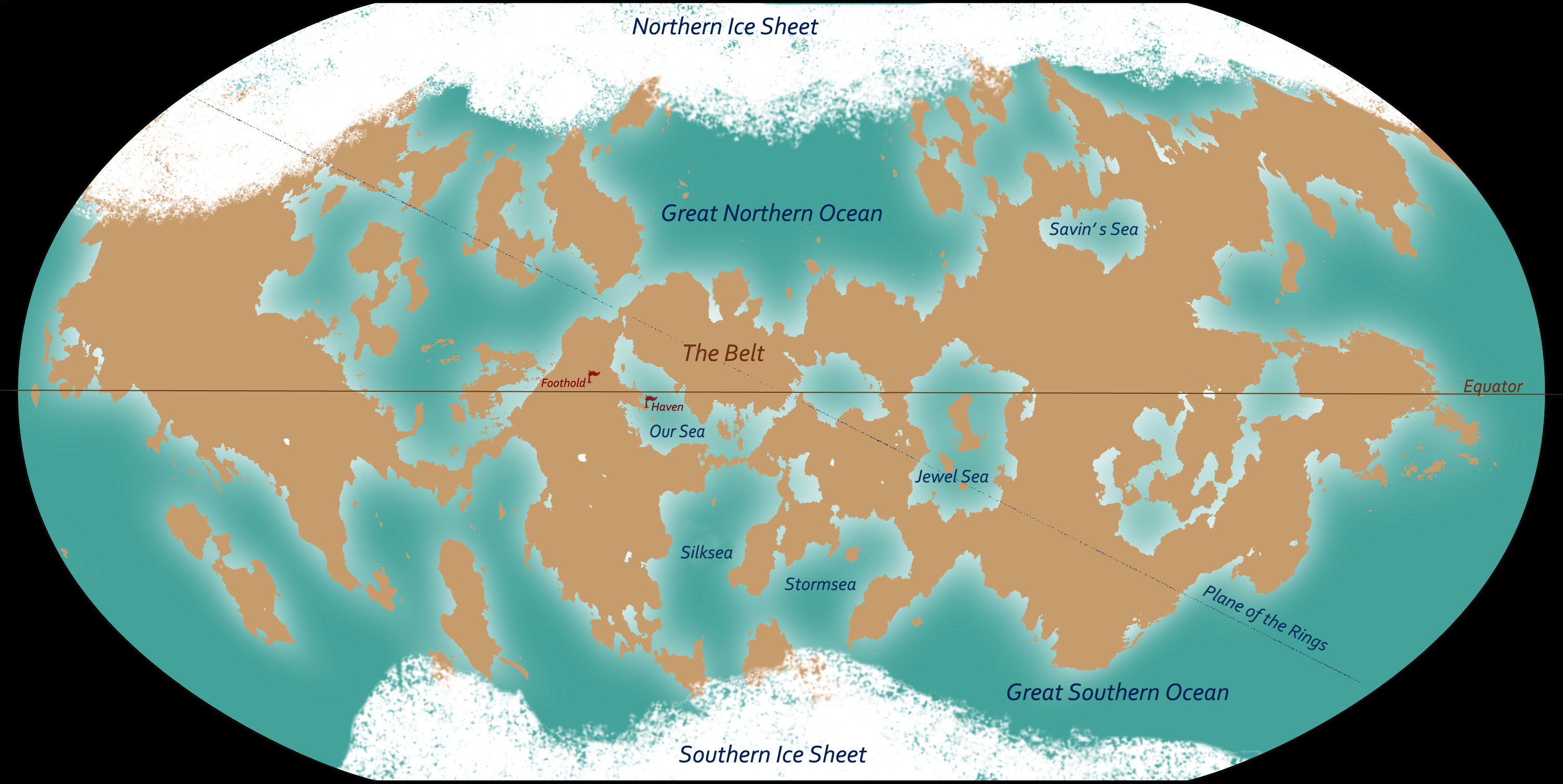 Unlike Abode, which features several large continents isolated by deep oceans, Homestead features one supercontinent, the Belt, which encircles the middle latitudes, and many large islands scattered through the Northern and Southern Oceans. Most supercontinents feature huge island deserts, but the Belt is broken up with many locklanded seas and fjords – and the dense atmosphere allows moisture-rich air to reach far inland. As a result, Homestead has very few deserts – and none with the scale of the Burning Waste or the Cauldron on Abode.